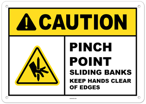 Caution Pinch Point Sliding Banks Keep Hands Clear of Edges Sign