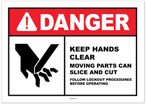 Danger Moving Parts Can Slice and Cut Keep Hands Clear Follow Lockout Procedures Before Operating Sticker