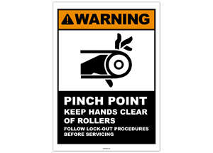 Warning Pinch Point Keep Hands Clear of Rollers Follow Lock-out Procedures Before Servicing Sticker