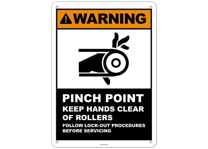Warning Pinch Point Keep Hands Clear of Rollers Follow Lock-out Procedures Before Servicing Sign