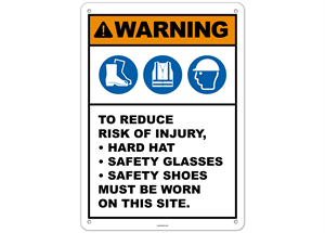 Warning To Reduce Risk of Injury - Hard Hat - High Visibility Vest - Safety Shoes Must Be Worn On This Site Sign